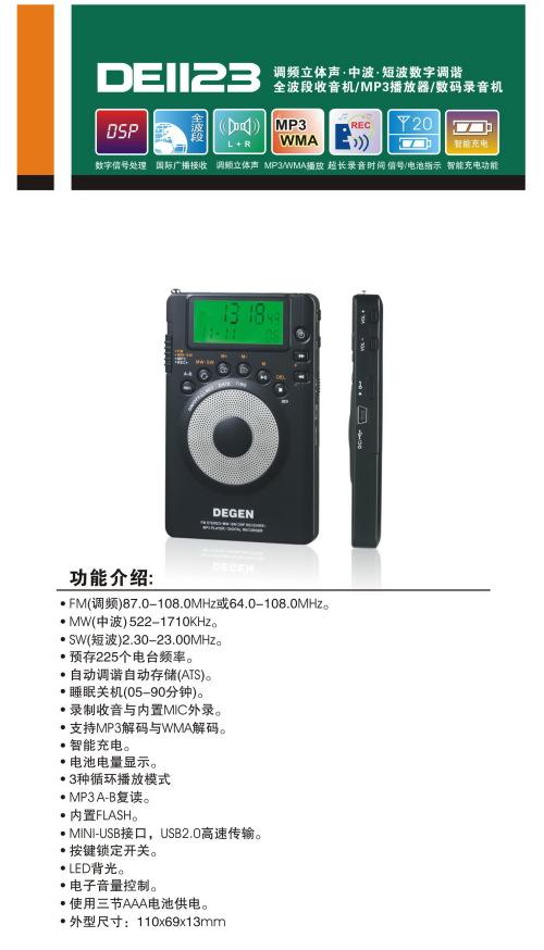 此外,德勁公司近期還推出了另一款超薄數(shù)字調諧收音機DE1123。該機內嵌MP3,集全波段數(shù)碼收音、數(shù)碼錄音、MP3播放多功能于一體,收錄放自如;而其外型尺寸只有110*69*13mm,小巧玲瓏,方便攜帶。DE1123不僅功能強勁,外型小巧超薄,而且塑料外殼手感非常好,按鈕靈活,非常人性化。FM調頻范圍在87.00-108.00MHz或64.00-108.00之間可以互相轉換收聽,非常適合校園學生一族,F(xiàn)M\MW\SW可一鍵切換,SW快速米波段轉換,彌補了沒有數(shù)字鍵的遺憾。據(jù)了解,該機在傳統(tǒng)收音機的基礎之上嵌入數(shù)碼元素,創(chuàng)新技術在國內行業(yè)尚屬首創(chuàng)。