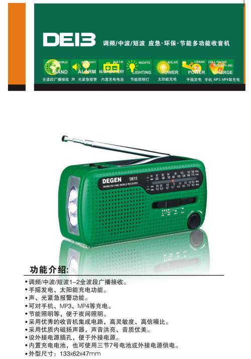 在缺電的災區(qū),隨同前往的德勁電子公司研發(fā)人員發(fā)現(xiàn),如果能讓收音機兼?zhèn)涫謾C充電器和手電筒的功能,就能解決晚上照明和個人應急通信。幾個月后,一款集應急、環(huán)保、節(jié)能等多功能于一體的收音機新品——德勁DE13研發(fā)成功并投放市場。德勁DE13具有全波段收音、手搖發(fā)電、太陽能充電功能,而且可以對手機、MP3、MP4等進行充電,該機還配有節(jié)能照明燈,便于夜間照明。該機型投放市場后,還受到了許多戶外一族的追捧,由于特有的手搖發(fā)電、太陽能充電功能(機器內置充電電池),外出旅游的時候不僅可以收聽廣播,了解新聞動態(tài)和天氣變化情況,還可以為手機充電。DE13還具有聲光警報功能,當遇到危險和需要救助時,利用收音機發(fā)出來的求救聲音和紅色閃光,引導救援。