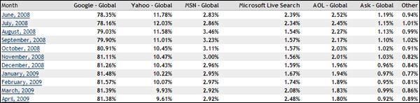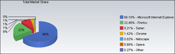 NetApplications上公布的統(tǒng)計(jì)數(shù)據(jù)顯示,今年4月IE的份額為66.1%,火狐為22.48%,蘋果Safari為8.21%,Chrome為1.42%。數(shù)年前,微軟IE市場(chǎng)份額曾高達(dá)90%以上,但近年來隨著火狐、蘋果Safari及谷歌Chrome等瀏覽器的崛起,微軟IE市場(chǎng)份額一直呈下降趨勢(shì)。