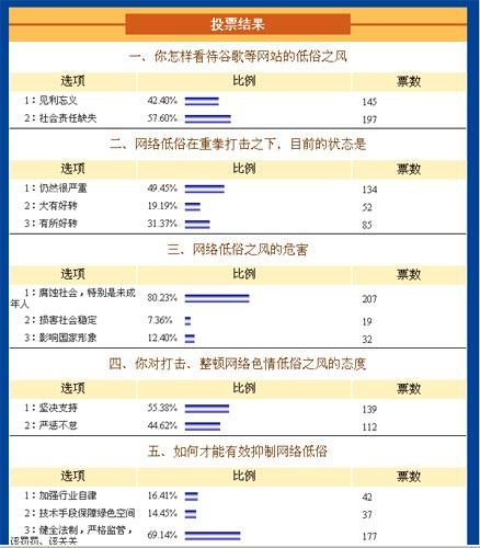 調(diào)查一推出就受到了的網(wǎng)民關(guān)注,他們積極參與投票和留言。截至目前,55.38%的網(wǎng)友選擇了堅(jiān)決支持打擊、整頓網(wǎng)絡(luò)色情低俗之風(fēng);69.14%的網(wǎng)友投票要求有關(guān)部門(mén)“健全法制,嚴(yán)格監(jiān)管,該罰罰,該關(guān)關(guān)”。