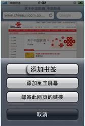 ⑹網(wǎng)頁(yè)管理界面主要包括“添加書簽”、“添加制主屏幕”和“郵寄此網(wǎng)頁(yè)的鏈接”三個(gè)選擇。選擇“添加書簽”按鈕,可將該網(wǎng)頁(yè)的網(wǎng)址加到書簽列表中;選擇“添加制主屏幕”按鈕,可形成屏幕快捷鍵;選擇“郵寄此網(wǎng)頁(yè)的鏈接”可將該網(wǎng)頁(yè)的網(wǎng)址發(fā)送給別人。