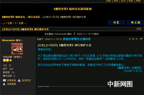 記者登陸《魔獸世界》中文官網(wǎng)臨時(shí)論壇發(fā)現(xiàn),網(wǎng)易已于昨晚發(fā)布《魔獸世界》例行維護(hù)公告,公告稱,為了保證服務(wù)器的穩(wěn)定運(yùn)行,將于11月3日凌晨 3:00 開始對(duì)現(xiàn)有全部服務(wù)器進(jìn)行例行維護(hù),停機(jī)時(shí)間預(yù)計(jì)為12小時(shí)左右。同時(shí)“客服電話服務(wù)”也將暫停12小時(shí)。