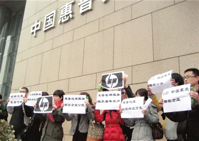 當(dāng)天上午10點(diǎn)半左右,在國貿(mào)橋東南角的中國惠普大廈門前,十余名消費(fèi)者手舉自制的紙牌抗議,引來路人圍觀。紙牌上寫著“蟑螂無罪惠普可恥”、“HP,中國最受鄙視企業(yè)”、“惠普之道,以狡辯應(yīng)萬變”等口號?棺h進(jìn)行了10分鐘左右,消費(fèi)者來到中國惠普大廈的8層,看到“惠普解決方案體驗(yàn)中心”的招牌后,消費(fèi)者又舉起紙牌進(jìn)行抗議,并要求與售后總監(jiān)談判。11點(diǎn)左右,惠普售后總監(jiān)陳女士來到現(xiàn)場。