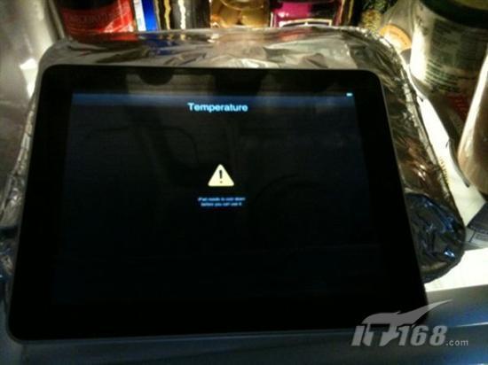 引自:“PC Magazine編輯Zach Honig在twtter” 他帶著他全新的iPad在紐約市出外曬太陽(前幾天紐約市的氣溫都超過攝氏20度左右),十分鐘后iPad就出現(xiàn)了“iPad需要降溫后才能使用”的信號然后關機。Honig把他的iPad放進冰箱中,然后幾分鐘后iPad就回復正常了。