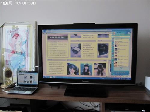 相比較,我的EeePC功能還是更齊全一些,1201N是12英寸的機(jī)器,對于視覺的要求,我用HDMI把它和家里46英寸電視連接,因為平時不喜歡看電視,所以家里的松下等離子就變成了上網(wǎng)之用,如下圖所演示,46英寸的顯示器,也是很爽滴!