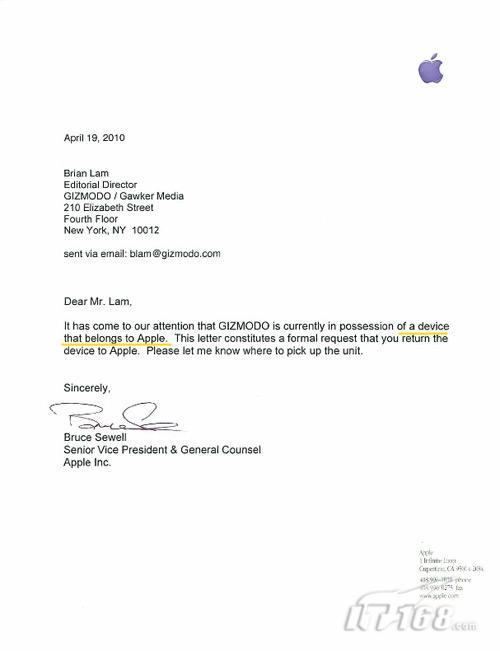 在與軟件工程師鮑威爾通過(guò)電話(huà)之后,蘋(píng)果公司首席法律顧問(wèn)兼主管法律和政府事務(wù)的高級(jí)副總裁Bruce Sewell(此前是Intel的法律顧問(wèn))又給Gizmodo網(wǎng)站的編輯Brian Lam發(fā)送了一封電子郵件,信的內(nèi)容是:Gizmodo網(wǎng)站拿到的那臺(tái)iPhone屬于蘋(píng)果公司,現(xiàn)正式要求你們將其歸還給蘋(píng)果,請(qǐng)告知取回的地址。