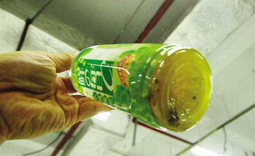 在路邊便利店買了一瓶“康師傅”葡萄汁飲料,仰脖喝下大半瓶后,突然感覺有異物,對著燈光細看,竟發(fā)現(xiàn)飲料瓶里沉淀有許多黃色的絮狀物品,還有一坨黑乎乎的沉淀物,這是10月16日晚陳先生在福州道山西路一便利店遭遇的一幕。