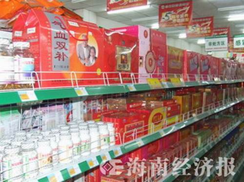 昨日下午,記者在?诮诸^走訪,發(fā)現(xiàn)幾乎所有藥店都經(jīng)營保健食品。在瓊山區(qū)府城鎮(zhèn)建國路瓊山人民醫(yī)院附近的一些藥店,保健食品甚至占去大半柜臺。海秀路西一家規(guī)模較大的藥店干脆“變身”成了雜貨鋪,洗衣粉、沐浴液、化妝品一應(yīng)俱全。按藥店老板的話說,現(xiàn)在滿街是藥店,朝超市化方向發(fā)展,也是在培育新的利潤增長點。