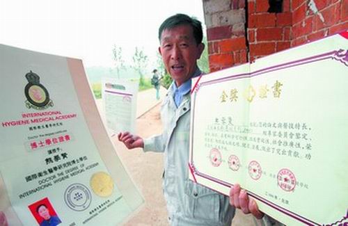 熊學(xué)賢從一個箱子內(nèi)抱出一疊厚厚的證書:中華科技咨詢專家、全國首屆十大高級民間傳統(tǒng)療法師金獎、中華人民共和國杰出人才、世界名人學(xué)術(shù)博覽會發(fā)明專利金獎、英國醫(yī)學(xué)院自然醫(yī)學(xué)及天然藥物研究中心客座課題教授、日內(nèi)瓦發(fā)明家公會會員……據(jù)了解,這些榮譽稱號是由世界民間傳統(tǒng)療法師聯(lián)誼會、北京炎黃經(jīng)絡(luò)研究中心、香港國際醫(yī)學(xué)科學(xué)研究院、國際衛(wèi)生醫(yī)學(xué)研究院等組織頒發(fā)給他的。