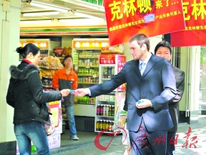 昨日,一位名叫“克林頓”的人在東莞街頭給消費(fèi)者免費(fèi)派發(fā)其代言的安全套(見上圖)。不過,這位“克林頓”可不是前美國總統(tǒng)比爾·克林頓,而叫威廉·比利·克林頓,加拿大人。對于商家的宣傳手法,有市民質(zhì)疑這是借美國前總統(tǒng)克林頓的名字來制造噱頭。(記者 周偉涵 通訊員 黃菲 攝)