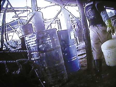 場(chǎng)內(nèi)僅見(jiàn)一名40多歲的女工,她正從榨油機(jī)的油槽里舀出油來(lái),裝到一個(gè)臟兮兮的油桶里。聽(tīng)記者說(shuō)是來(lái)購(gòu)油的,她說(shuō)老板不在。油池旁擺放著五六個(gè)鐵油桶,據(jù)女工介紹,每個(gè)油桶能裝 150多公斤的油。記者問(wèn):“一天能產(chǎn)多少油?”“我一個(gè)人三天榨一桶油!币源斯浪悖@個(gè)煉油窩點(diǎn)平均一個(gè)工人每天大約能生產(chǎn)50公斤“潲水油” 。據(jù)知情人士透露,這家煉油窩點(diǎn)平日一般有六至八個(gè)工人負(fù)責(zé)煉油,一個(gè)月提煉的“潲水油”產(chǎn)量可達(dá)三四十噸。 記者問(wèn)起做煉油有沒(méi)有覺(jué)得不舒服,這位來(lái)自江西的女工稱:“我老公來(lái)汕頭建橋,我原來(lái)到這里是給(工人)做飯,本來(lái)我不做這個(gè)(煉油)的,太臟了!那些都像垃圾一樣的!整天在這里做,身上很臭……”