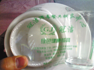 這兩家產(chǎn)品一個名叫“冠潔”,一個名叫“天康”。飯店老板告訴記者,名為“冠潔”的餐具是最近才進入市場的,而名叫“天康”的餐具則已經(jīng)有了一段時間。“冠潔餐具的老板是我們礦區(qū)衛(wèi)生局長的丈夫,他親自登門推銷,我們也不敢說什么,只好用一些!