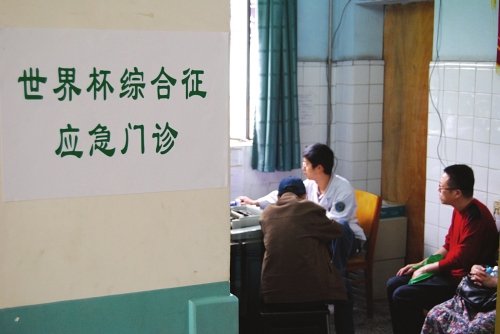 昨日上午,成都市第三人民醫(yī)院急診科主任魏鳴將印有“世界杯綜合征應(yīng)急門診”門牌貼在急診內(nèi)科門口。從今天開始,這個(gè)應(yīng)急門診將24小時(shí)為球迷們服務(wù)。9名醫(yī)生中除了一名女醫(yī)生,其他的人全是球迷。門診沒有安裝電視,對(duì)于球迷醫(yī)生來(lái)說(shuō),值班的晚上也是痛苦的煎熬。