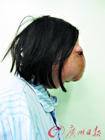 “活檢結(jié)果還沒(méi)出來(lái),基本確定是‘骨纖維異常增殖癥’,其實(shí)也就是她的顱腦內(nèi)、頜面部有著巨大腫瘤。”廖貴清教授表示,她的腫瘤與頭部等大,雖然呈良性無(wú)礙生命,但嚴(yán)重影響其生活。
