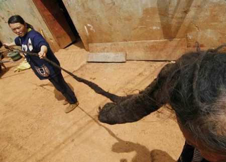 老人說,從她10歲那年起,她就開始養(yǎng)這辮子了。開始的時候辮子只有一尺長,她一天要梳幾次,也經(jīng)常洗。但頭發(fā)漸漸長了,實在難以梳洗,她就干脆不梳頭少洗發(fā),原來3天洗一次已經(jīng)很難受了,后來又逐漸變成一個星期、10天,有時甚至半個月才洗一次頭。一轉(zhuǎn)眼,她這長辮子已養(yǎng)了50年,她也有40年沒梳過頭了。現(xiàn)在,劉老太的辮子與其說是一根辮子,不如說是一根雜草編織的“手臂”。