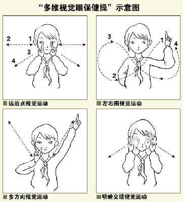 據(jù)介紹,“多維視覺眼保健操”時(shí)長5分鐘,分“遠(yuǎn)近點(diǎn)視覺運(yùn)動(dòng)”、“左右圓線視覺運(yùn)動(dòng)”、“多方向視覺運(yùn)動(dòng)”、“明暗交替視覺運(yùn)動(dòng)”4節(jié)。做操時(shí),或雙手食指豎起,向前后上下左右方向伸出,或單手在眼前畫8字;眼睛始終盯著手指,隨著手指運(yùn)動(dòng)調(diào)整目光。