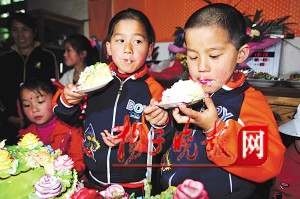 踩過“步步糕”和“子孫蛋”后,儀式最重要的部分開始了。當(dāng)年的主刀醫(yī)生、南京市兒童醫(yī)院新生兒外科徐小群主任醫(yī)師和護(hù)士長(zhǎng)夏娟各剪斷了一條尾巴,并送上了禮物——兩個(gè)書包。一下子見到那么多生人,兩個(gè)孩子似乎有點(diǎn)不太適應(yīng),連平日里一向活潑的蘇寧也變得沉默寡言起來。只有在吹完蠟燭吃蛋糕時(shí),兩個(gè)孩子才放松下來,丟下手中的叉子直接啃起了蛋糕。