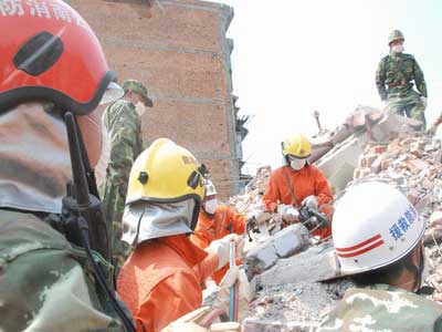 10時(shí)25分,消防官兵在對漢旺鎮(zhèn)災(zāi)區(qū)天池礦業(yè)公司家屬樓進(jìn)行搜索救援時(shí),突然聽到廢墟中傳來一陣微弱的呼救聲。還有幸存者!馬上進(jìn)行救援!全力挽救幸存者的生命!隨著現(xiàn)場指揮員的一聲令下,參戰(zhàn)消防官兵在指揮員的嚴(yán)密組織下科學(xué)施救,充分發(fā)揮消防部隊(duì)的裝備優(yōu)勢和救援經(jīng)驗(yàn),迅速使用液壓剪、切割機(jī)迅速清除幸存者上方的鋼筋、鐵條等物,搬除身上埋壓的石板、水泥塊,為幸存者開辟救生通道。