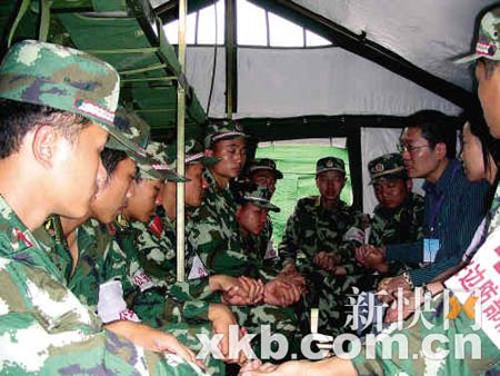“300名孩子的尸體都堆在學(xué)校。我們就在不遠(yuǎn)處扎營(yíng),晚上夢(mèng)見死去的孩子們?nèi)空酒饋砹顺易哌^來……”戰(zhàn)士小駱流著淚抓住心理救援隊(duì)專家的手訴說著。前日,廣州心理救援隊(duì)來到了廣東公安邊防總隊(duì)某支隊(duì),在帳篷里為115名官兵進(jìn)行心理輔導(dǎo)!皯(zhàn)士們?cè)诰仍畷r(shí)遇到的問題已經(jīng)超過了他們的承受范圍,他們急需心理輔導(dǎo)。”和戰(zhàn)士們交流之后的胡慎之醫(yī)生表達(dá)了自己的擔(dān)憂。