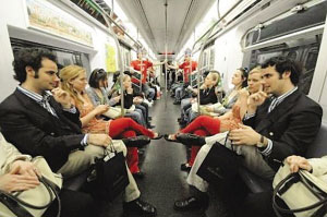日前,15對同卵雙胞胎按照亞當斯的要求,一起在紐約市布魯克林橋的地鐵站碰頭,15對同卵雙胞胎走進地鐵車廂后,每對雙胞胎都排著隊各自坐在了過道兩側(cè)的座位上,并且每個雙胞胎要直接面對著自己的雙胞胎兄弟或姐妹。當15對雙胞胎“各就各位”后,他們接下來要做的事就是盡可能保持動作一致,如果一個雙胞胎用手撓頭,那么他的同卵雙胞胎也必須用手撓頭;一個雙胞胎看報紙,他的同卵雙胞胎也必須低頭看報紙。總之,他們就好像是對方的“鏡中影像”一樣。這些同卵雙胞胎還被告知,如果有乘客詢問他們到底發(fā)生了什么事,他們要表現(xiàn)得一無所知,甚至好像壓根沒看到坐在自己對面的同卵雙胞胎一樣。