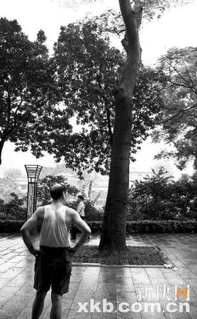 下午5時(shí)25分,記者趕到事發(fā)現(xiàn)場,在離公園入口約150米處的一棵樹下有大一攤血跡,旁邊有兩個(gè)塑料袋。這棵鳳凰樹高約20米、直徑約20厘米,沒有明顯雷擊痕跡。幾位市民正拍著胸口在驚嘆自己險(xiǎn)些遭到雷擊。