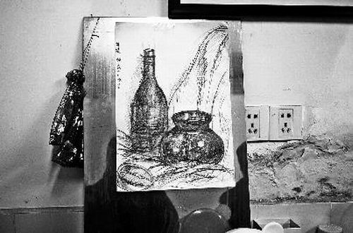 屋里的一面沙發(fā)上,還有十多張?bào)泱惝?huà)的素描,其中一張素描《瓶子和橙子》擺放在客廳。這張畫(huà)上的字跡與她寫(xiě)給母親的遺言條字跡如出一轍。