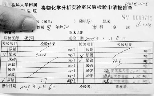 當(dāng)時正患重度蕁麻疹的他,在看帖子的當(dāng)天就到醫(yī)院打麻藥拔掉了3顆烤瓷牙。第二天,又專門請假到朝陽醫(yī)院做尿鎳測試。幾天后,他拿到了一份讓他“一下子懵了”的報(bào)告單,單子上顯示:他尿液中的鎳含量為144個單位!