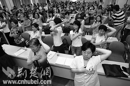 “乳房疾病很煩惱,自我檢查很重要,先舉手,后叉腰,對(duì)著鏡子仔細(xì)瞧……”昨天,一群女性在同濟(jì)醫(yī)院醫(yī)生帶領(lǐng)下,吟誦《乳房自查口訣》,做瑜伽操。