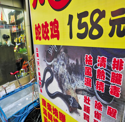 “打死我都不敢吃!”市民劉先生在黃泥塝看到某餐館推出的“蛇咬雞”招牌后說,這些吃法太怪了。劉先生介紹,招牌上還說,吃“蛇咬雞”可以醒腦、除雀斑、排臟毒、祛風濕等!斑@不僅太殘忍,太血腥,也不道德!睆埮空f,希望這僅僅是個別餐館吸引顧客而搞的噱頭。
