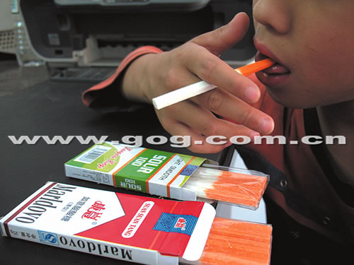 記者看見,劉女士從兒子那里收繳的某品牌的酸酸糖是廣東一家食品廠生產的,從外包裝看,它就像一包香煙,每盒5支裝,每一支酸酸糖乍一看與一支香煙沒有區(qū)別,過濾嘴是用黃色色素染出來的。