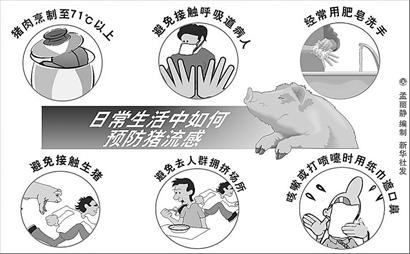 避免接觸流感樣癥狀(發(fā)熱,咳嗽,流涕等)或肺炎等呼吸道病人;注意個(gè)人衛(wèi)生,經(jīng)常使用肥皂和清水洗手,尤其在咳嗽或打噴嚏后;避免接觸生豬或前往有豬的場(chǎng)所;避免前往人群擁擠場(chǎng)所;咳嗽或打噴嚏時(shí)用紙巾遮住口鼻,然后將紙巾丟進(jìn)垃圾桶;如在境外出現(xiàn)流感樣癥狀(發(fā)熱,咳嗽,流涕等),應(yīng)立即就醫(yī)(就醫(yī)時(shí)應(yīng)戴口罩),并向當(dāng)?shù)毓残l(wèi)生機(jī)構(gòu)和檢驗(yàn)檢疫部門說(shuō)明。