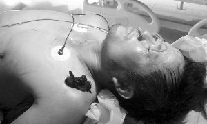 在同仁醫(yī)院急診室,記者見到了受傷的民工。他躺在病床上動彈不得,兩邊耳廓后面還在流血,左邊肩部,一根比拇指還粗的螺紋鋼筋,從腋下一直穿到肩部,肩膀外面露出一寸多長的鋼筋頭。鋼筋還被一層布包著,那是民工的衣服,鋼筋戳到他時,衣服也被一起戳進(jìn)了肉里。