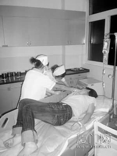 記者趕到醫(yī)院時(shí),醫(yī)護(hù)人員正為3名女子洗胃。她們的頭邊,布滿了吐出的穢物,一名穿黑色衣服的男子在旁邊急得團(tuán)團(tuán)轉(zhuǎn)!八齻兌际俏业挠H人,其中一人是我老婆,具體是怎樣中毒的我也不清楚,接到電話剛趕過(guò)來(lái)!彼f(shuō),“晚上親戚從湖里寨上趕過(guò)來(lái)串門,在家里做的晚飯,吃過(guò)不久,一個(gè)親戚就嘔吐。隨后大家都吐了,手腳發(fā)黑、嘴唇發(fā)干。晚飯的菜是兩個(gè)女孩在外面買的,有青菜、也有蝦、肉丸等!