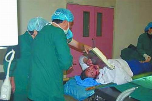 8時多,剛到醫(yī)院的張紅立刻被推上手術(shù)臺!拔覐尼t(yī)17年,還是頭一次見到這樣的病例!笨谇豢浦魅问Y衛(wèi)東說:“門把手就像個十七八厘米長的大魚鉤,把她整個鉤住了,腦袋掛在把手上,好在把手是光滑的、鈍的,沒有刺到后顱腦,要不,誰也拿不下來”。