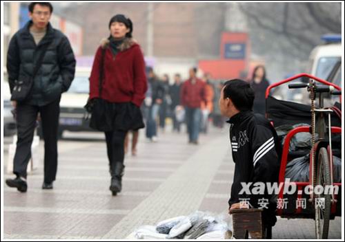 “襪子10塊錢4雙,大家來看看!弊蛉(12月18日)下午3時許,在東大街上,尋常的叫賣聲中,一個小販坐在小木凳上,身著破舊的運動服,面前是一個小地攤,放著各色各樣的新襪子。他的身體倚著一輛手搖車,面帶微笑地望著過往行人。
