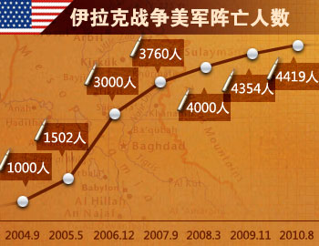 在攻打伊拉克的大規(guī)模軍事行動中,美軍只有138名軍人喪生。但此后美軍頻繁遭到伊拉克境內(nèi)反美武裝的襲擊,傷亡人數(shù)不斷攀升。截至2010年8月16日,駐伊美軍死亡總數(shù)已達(dá)4415人,另有約3.2萬人在戰(zhàn)斗中受傷。龐大的軍費(fèi)開支也給美國經(jīng)濟(jì)造成沉重負(fù)擔(dān)。截至2010年8月19日,美國用于伊戰(zhàn)的開支已達(dá)7423億美元,平均每天耗費(fèi)2.75億美元。