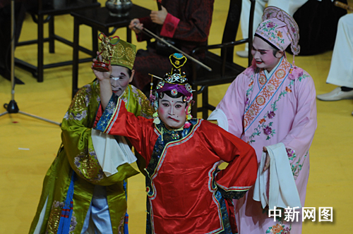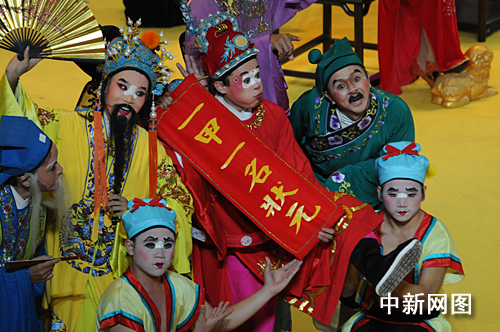 圖為閩南特色節(jié)目“南音交響”。南音和梨園戲、莆仙戲、高甲戲等南戲被稱為“閩南活化石”。舞蹈表演薈萃了南戲梅花獎(jiǎng)演員和高甲群丑的精湛表演。