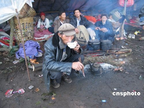圖為十一月六日,被緊急安置的村民們在救災帳篷前吃早飯。中新社發(fā) 保旭 攝