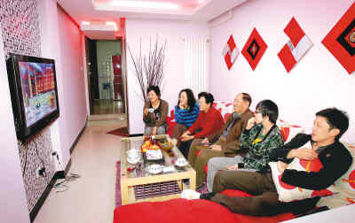 劉樂(lè)(左二)和家人在裝飾一新的客廳里看電視。人民日?qǐng)?bào)記者 李石營(yíng)攝