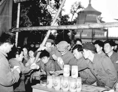 一九七九年四月,顧客在北京市首次舉辦的天壇商品交易會(huì)上爭(zhēng)購(gòu)搪瓷保溫杯。徐建中攝