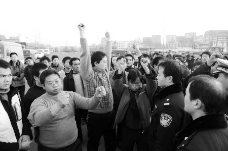 雙方發(fā)生第二次撕扯。眼看兩名勸解的民警被淹沒在人群中,立即過來五六名民警才將雙方隔開。