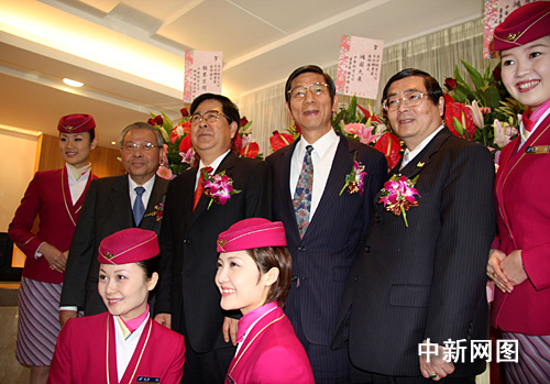 1月15日,大陸南方航空公司在臺(tái)北正式成立辦事處,成為首家在臺(tái)灣掛牌運(yùn)營的大陸企業(yè)。圖為開業(yè)揭幕儀式典禮上南航空姐與參加儀式的臺(tái)灣和大陸嘉賓合影。中新社記者 陳立宇 攝