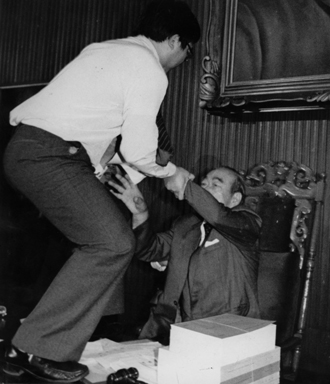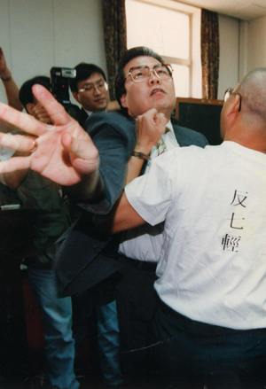 當(dāng)朱高正跳上主席臺(tái),議場(chǎng)內(nèi)頓時(shí)像爆發(fā)的活火山,趙少康等人沖上發(fā)言臺(tái),抓住高站在主席臺(tái)上的朱高正的腳踝。后排的“立委”則大喊“上。 薄按蛩浪,打死他!”,個(gè)個(gè)爭(zhēng)先恐后沖向主席臺(tái)。