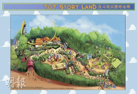 以電影《反斗奇兵3》為骨干,在區(qū)內(nèi)擺放各式超巨型玩具,旅客置身其中,如變了小矮人。區(qū)內(nèi)有3個機動游戲:其一是賓客坐上如“臘腸狗”的設施,經(jīng)歷一段顛簸旅程;另一設施是一臺穿梭飛車,接載賓客沿高達數(shù)十呎的U形軌道快速來回;最后是一個“跳傘”訓練旅程,賓客可因應喜好,調校從25米高臺向下急墜的速度。