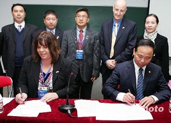 12月7日,美國(guó)圣地亞哥河景小學(xué)和福州實(shí)驗(yàn)小學(xué)在福州簽訂了建立姐妹學(xué)校意向書。當(dāng)日,中美中小學(xué)校長(zhǎng)座談會(huì)在榕舉辦,美國(guó)33名中小學(xué)代表與福州近20所中小學(xué)校長(zhǎng)及教師代表進(jìn)行了廣泛深入的交流,共同探討漢語(yǔ)教學(xué)與中國(guó)文化交流以及在美國(guó)中小學(xué)開設(shè)孔子課堂及派遣赴美漢語(yǔ)教學(xué)志愿者等項(xiàng)目合作意向。(中新社/張麗君 攝)