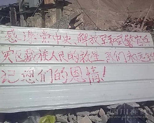 據(jù)當?shù)孛襟w報道,救援隊員不顧疲勞,盡全力救人,餓了干吃方便面,累了就靠著廢墟休息。面對來自全國各地救援隊的忘我援助,玉樹州一職業(yè)技術學校的學生書寫標語:感謝黨中央、解放軍和武警官兵,災區(qū)藏族人民的救星,我們永遠銘記您們的恩情。