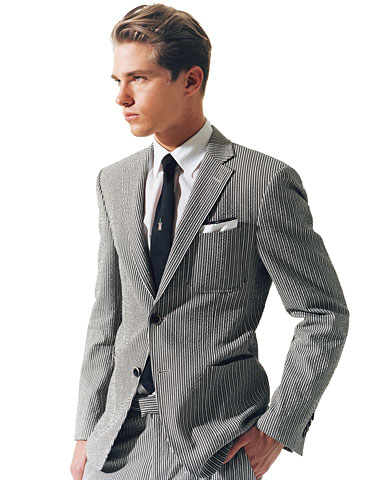 七:條紋外套?肯定!再發(fā)愁你的條紋西裝沒(méi)法穿么?的確,如今大概只有四歲的孩子和沒(méi)有時(shí)尚品味的人才會(huì)選擇那種淺色的泡泡紗外套來(lái)作為自己的“出場(chǎng)”服裝。但是,告訴你個(gè)方法,只要簡(jiǎn)單的加上黑色和白色的話(huà),這款搭配就變得相當(dāng)?shù)挠行汀⒊墒炝。搭配白色的襯衫,黑色的領(lǐng)帶,和一塊口袋方巾,那么無(wú)論是日常的辦公或者是小型的PARTY聚會(huì),就都很合適了!