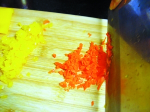 2 黃彩椒去蒂和籽,切成細(xì)末;紅蘿卜去皮,也切成細(xì)末;蔥去頭尾,切成蔥末。