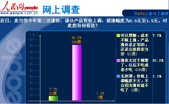2008年10月初,麥當(dāng)勞在一年內(nèi)第三次宣布漲價,部分產(chǎn)品售價上調(diào),提漲幅度為0.5元至1.5元。對此,人民網(wǎng)做了網(wǎng)上調(diào)查,共有273人參與。