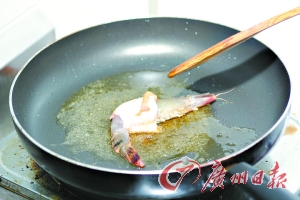 3. 放較多的油,油熱后把撈過香炸生粉的“翅蝦”放在鍋中炸至黃金色,時(shí)間約10分鐘。